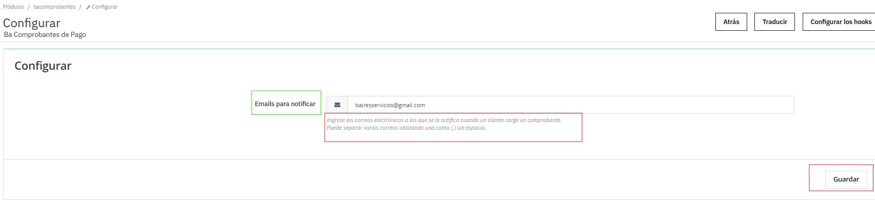 • En el campo Emails para notificar, ingresar las direcciones de correo que recibirán un aviso cada vez que un cliente cargue un comprobante.