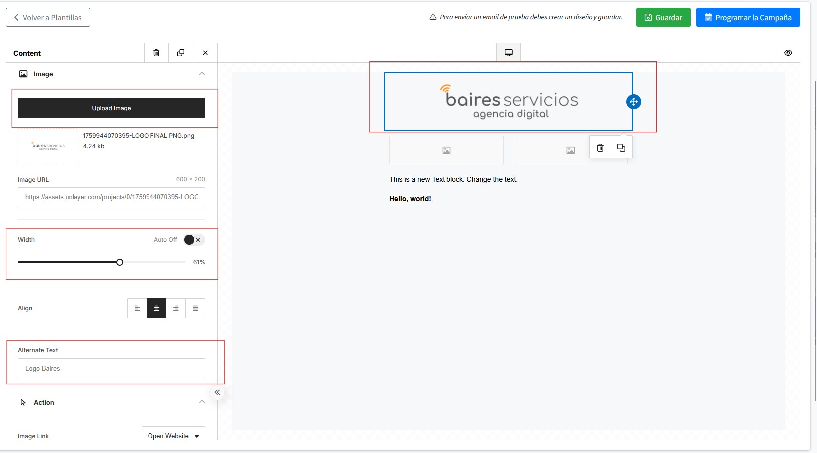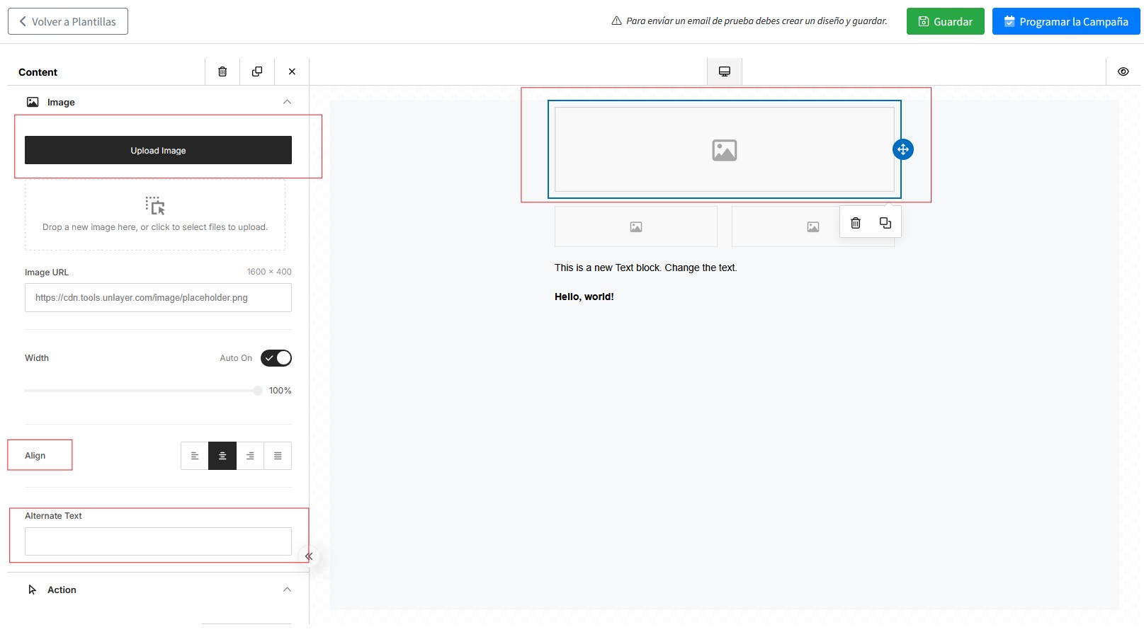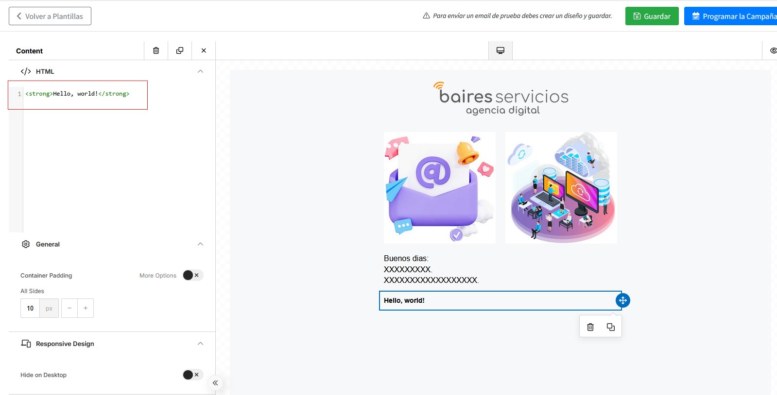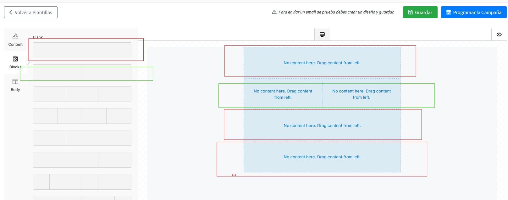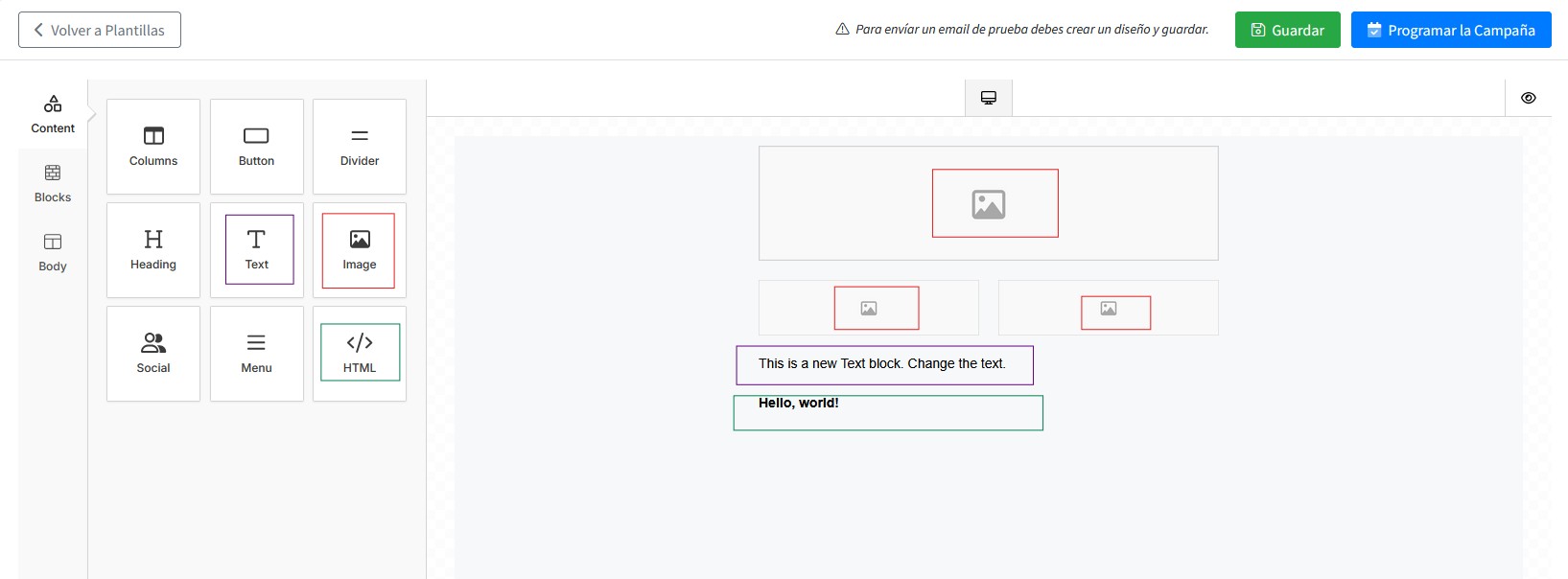 En cada bloque se puede insertar imágenes, textos o código HTML.