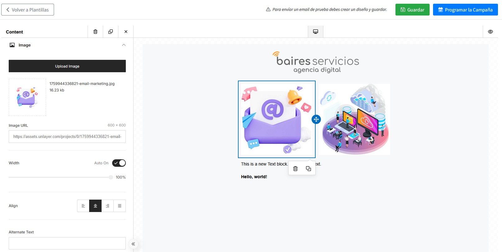 El bloque de texto funciona como un editor similar a Word. Podés aplicar formato (negrita, cursiva, tamaño, color, etc.).