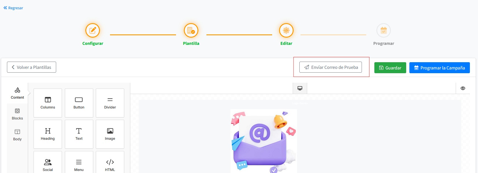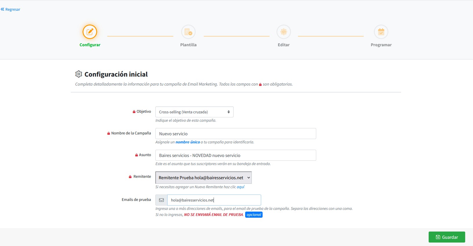 Hacer clic en Guardar. Una vez guardado, se habilita el botón “Enviar correo de prueba”.