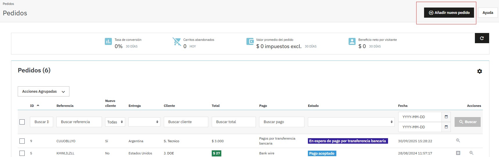 • Botón “Añadir nuevo pedido”: arriba a la derecha, crear un pedido manualmente.