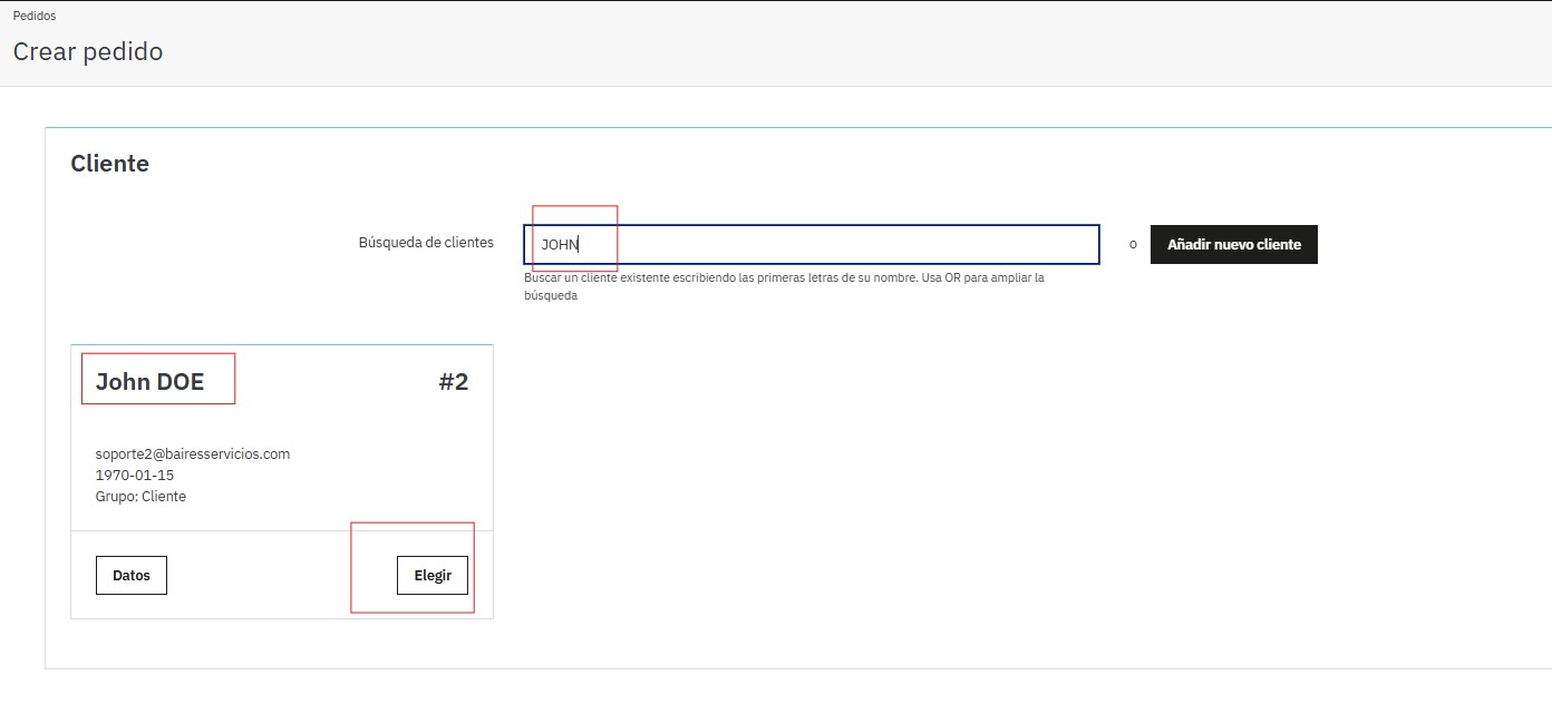 En el campo “Búsqueda de clientes”, escribir nombre, apellido o correo. El sistema mostrará coincidencias (ej.: al ingresar “JOHN”, aparece John DOE con datos básicos).