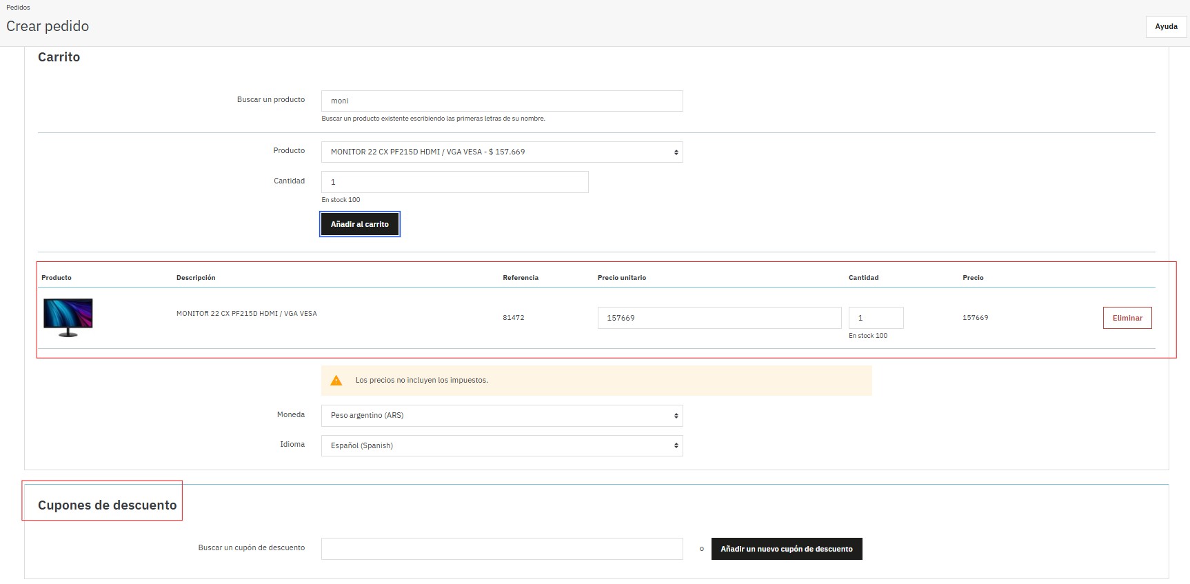 Con el cliente y las direcciones listas, se cargan productos y cupones si corresponde.