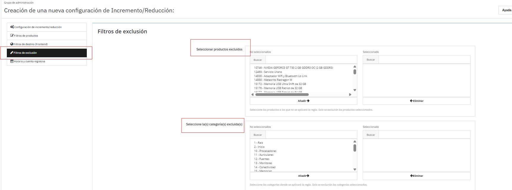 Excluir productos específicos (buscar y “Añadir ➡”).