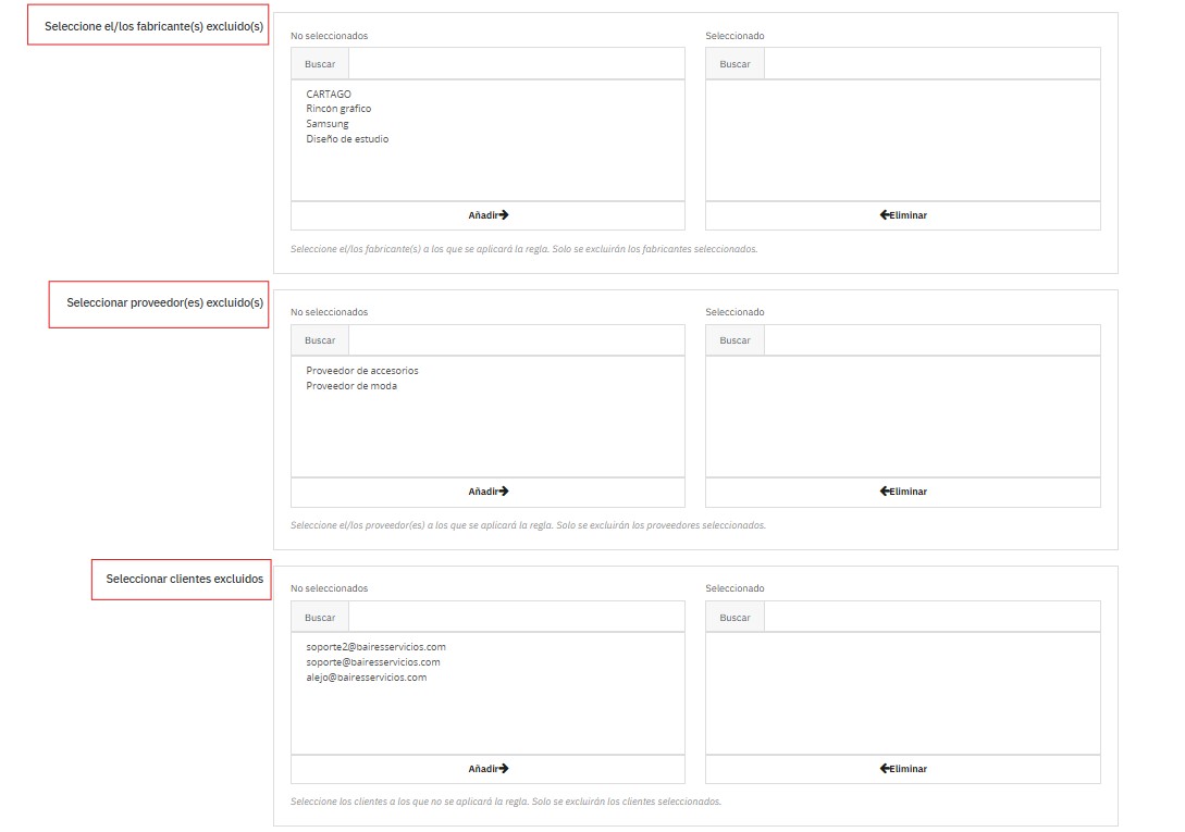 Permite excluir productos, categorías o clientes específicos de una regla general.