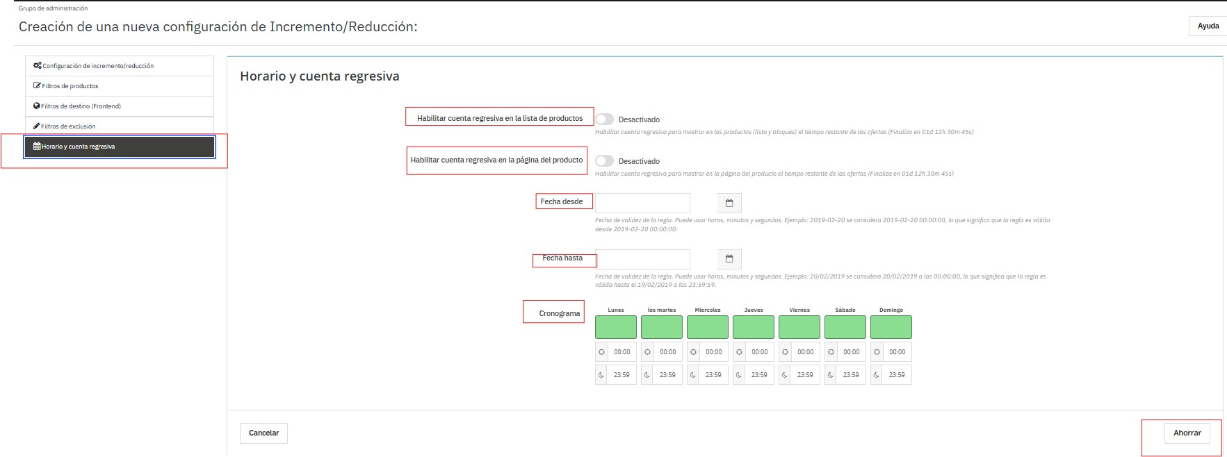Esta pestaña permite definir cuándo estará activa la regla y, si se desea, mostrar una cuenta regresiva visual para informar al cliente cuánto tiempo queda antes de que finalice la oferta.