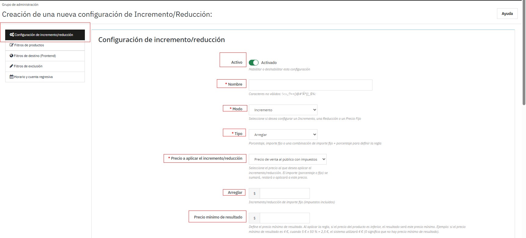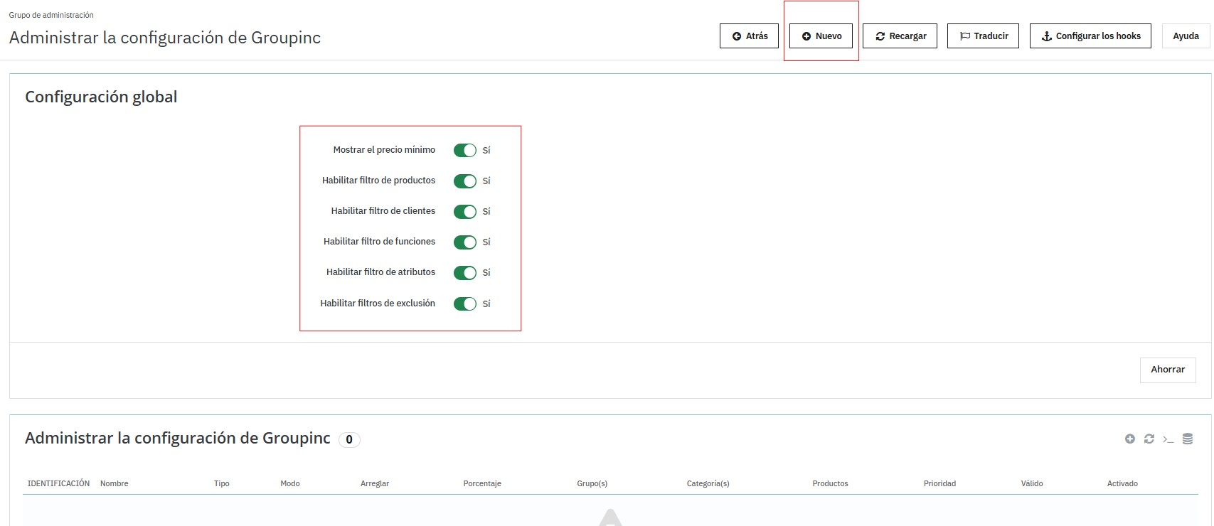 Al ingresar a la configuración del módulo, se muestra la sección Configuración global, donde se definen los parámetros generales que afectarán todas las reglas de incremento o descuento.