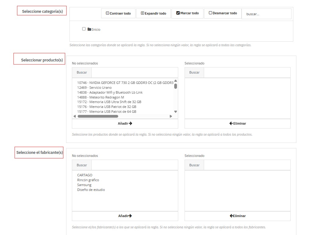• Ámbito: toda la tienda, una o varias categorías, marcas, proveedores o productos específicos.
