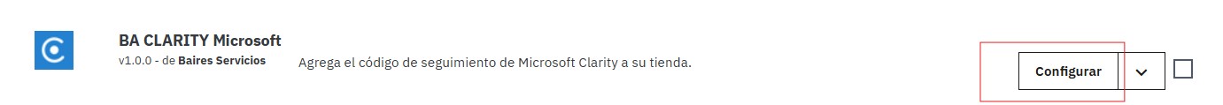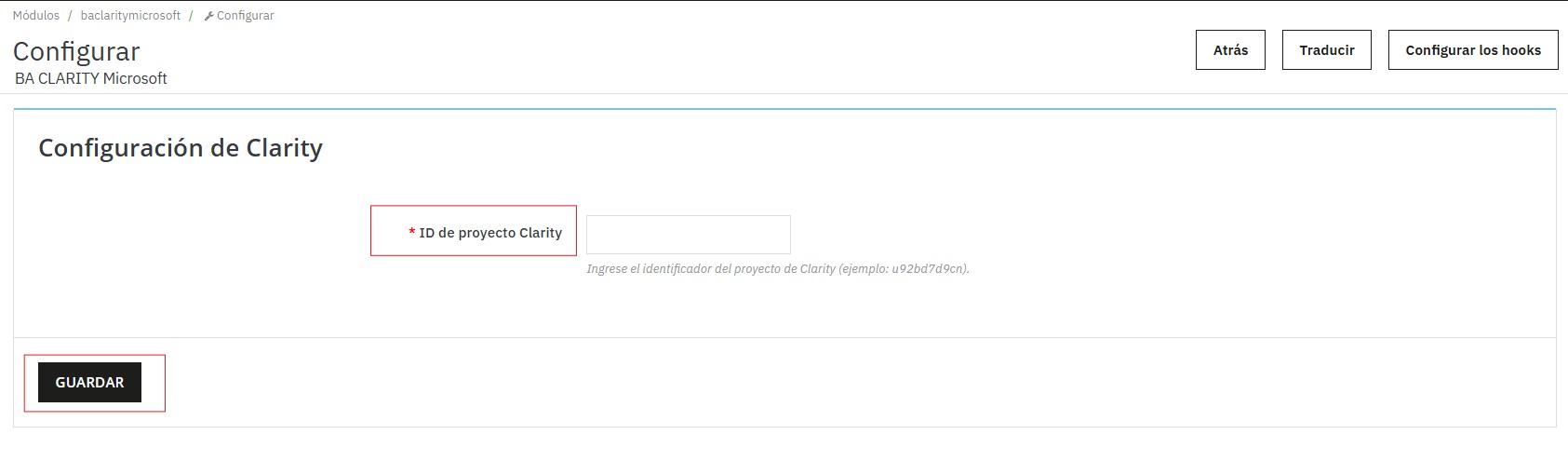 En este campo debés ingresar el identificador único de tu proyecto en Microsoft Clarity. El módulo indica un ejemplo para guiarte: u92bd7d9cn. Este ID se obtiene desde tu cuenta de Clarity al crear un nuevo proyecto.