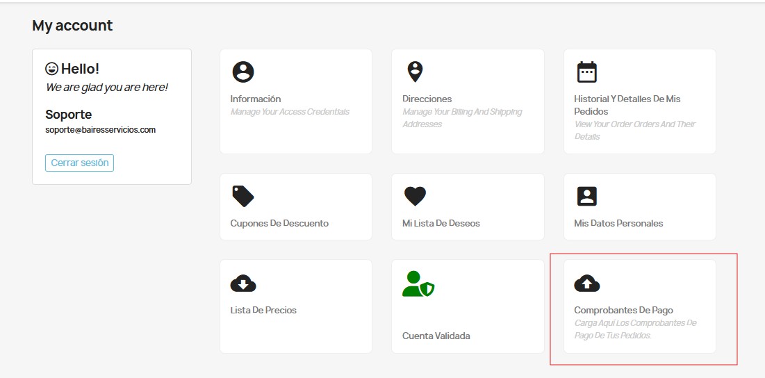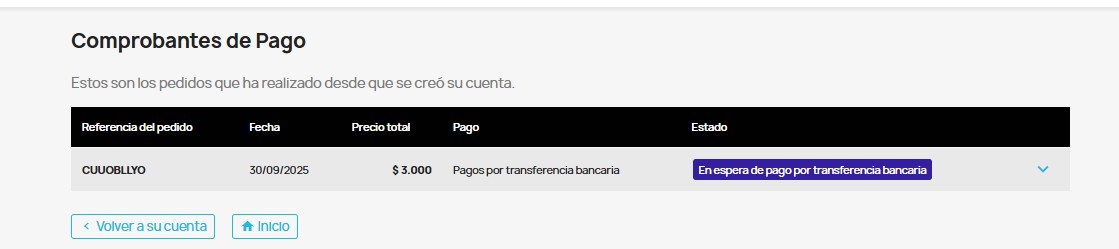 El cliente puede subir su comprobante de pago desde su cuenta personal en la tienda.