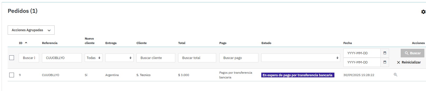 Localizar el pedido correspondiente (por ejemplo, uno con el estado “En espera de pago por transferencia bancaria”).