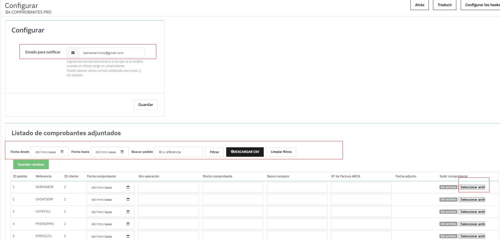 En la parte superior del módulo se encuentra la opción “Emails para notificar”, donde se deben ingresar los correos electrónicos que recibirán una notificación cada vez que un cliente cargue un comprobante.