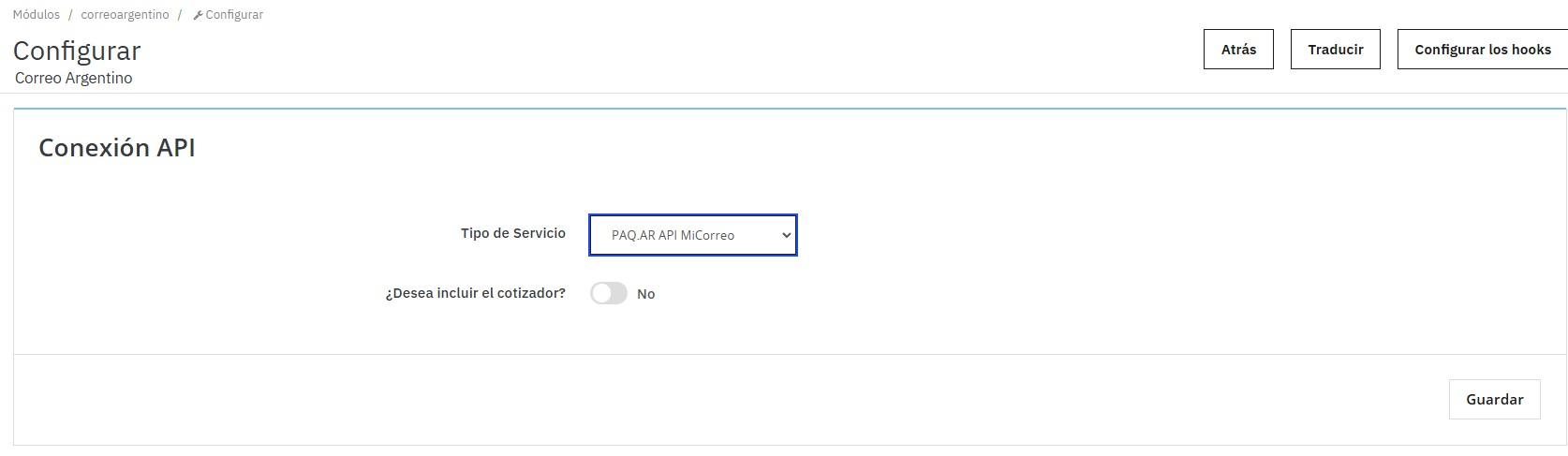 En esta sección se configuran los parámetros principales que permiten conectar la tienda con los servicios de Correo Argentino.